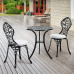 Enjoy your morning coffee out on the patio with the 3-piece bistro set, which includes two chairs and a small round bistro table. The set is constructed out of cast aluminum and finished in a durable powder coated black finish, so you can enjoy its companion for years to come. The intricate scrolled leaf detailing over the top of the table and chairs is sure to exude graceful styling to your outdoor decor. With its small footprint, this compact set is the perfect addition to any patio, balcony, or porch with limited space.