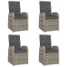 Reclining chair:Colour: GreyMaterial: PE rattan, powder-coated steelSitting dimensions: 57 x 69 x 106 cm (W x D x H)Lying down dimensions: 57 x 106 x 85 cm (W x D x H)Seat size: 47 x 50 cm (W x D)Seat height from the ground: 41 cmArmrest height from the ground: 63.5/61.5 cmTable:Colour: GreyMaterial: PE rattan, steel, solid acacia wood with an oil finish Overall dimensions: 90 x 90 x 75 cm (W x D x H)Cushion:Colour: Dark greyCover material: Fabric (100% polyester)Seat cushion filling material: FoamBack cushion filling material: FibreCushion thickness: 4 cm Delivery contains:4 x Reclining chair1 x Table4 x Back cushion4 x Seat cushion