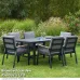 This generous set is perfectly for relaxed family dining in the garden or on the patio. 6 Seater Aluminium Dining Set is a 7 piece garden furniture set comprising 6 chairs and one large dining table.Made from high quality, powder-coated aluminium in dark antracite grey – the set is durable, lightweight, resistant to rust and weatherproof. The aluminium chairs feature a rope design and polywood arms. Comfort and practicality are ensured with grey, 5cm thick cushions which come with wipe dry and washable cushion covers.Assembly required. Store under cover in extreme weather conditions.6 Seater Aluminium Dining Set comprises:6 x chairs1 x large dining table5cm thick seat and back cushionsTable dimensions: 160 x 89.5 x 74cmsChair dimensions: 63 x 56 x 86cms