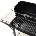 Colour: BlackMaterial: Steel + woodOverall size: 83 x 44 x 87 cm (L x W x H)Cooking height: 71-85 cmFire bowl: 55 x 33 cm (L x W)Side table size: 28 x 20 cm (L x W)Bottom shelf size: 56 x 31.5 cm (L x W)With 1 chrome-plated cooking grid with handlesWith 1 chrome-plated roaster kit with wood handleWith 2 plastic wheels for easy moving