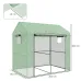 Home growing - twice over. This Outsunny 140 x 200cm greenhouse comes in a two-room design, so you can separate plants to how you want. With a steel frame, the core is sturdy, with four guy ropes and four ground stakes included to pin into ground. The plastic cover creates a protective shield for inside - plants grow with cover against wind and rain. 10cm cover edges to bury into soil for extra stability.Features:Two-room design: grow two different types of plants in their own spacePlastic, UV-resistant cover: a safe shield for plants insideRoll-up zipped door and mesh windows for easy access and ventilationSteel frame with middle tubes: a tough core10cm cover edges to bury into soilFour guy ropes and four ground stakes included Specification:Colour: GreenMaterial: Steel, PolyethyleneOverall Dimensions: 200L x 140W x 200HcmDoor Dimensions: 142W x 140HcmWindow Dimensions: 30W x 30HcmEdging Width: 10cmItem Label: 845-939V00GNPackage Includes:1 x Greenhouse4 x Guy Rope4 x Ground Stake1 x Manual
