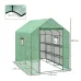 This Outsunny small plastic greenhouse with shelves is suitable for gardeners of all levels. With the UV-resistant plastic cover, roll-up door and three mesh windows, it is a safe shelter inside, allowing you to create a desirable temperature and humidity for total control. Four shelves on each side allow room for holding and organising pots and trays.Features:Walk-in greenhouse with four shelves on both sides. 213 x 140cm is a spacious sizeUV-resistant plastic cover for safe shelter to allow plants to growHemmed edging reinforces the cover and helps prevents tearingRoll-up zipped door and three mesh windows for easy access and ventilationOverlong cover, guy ropes and ground stakes make the greenhouse more stable and secureEasy to assemble, two people recommended Specification:Colour: GreenMaterials: Steel, PolyethyleneOverall Dimensions: 140W x 213D x 190H cmDoor Dimensions: 84W x 157H cmWindow Dimensions: 30W x 30H cmWire Shelf Dimensions: 60W x 25D cmShelf Spacing: 45 cmEdging Width: 10 cmShelf Weight Capacity: 10 kgItem Label: 845-931V00GNPackage Includes:1 x Greenhouse4 x Guy Ropes4 x Ground Stake24 x Clips1 x Manual