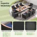 Transform your outdoor space with our exquisite patio dining set. Crafted from the acacia wood, the practical outdoor table shows timeless charm while ensuring durability. Embrace relaxation with the 5 cm umbrella hole, providing a shaded retreat under your parasol. Indulge in the utmost comfort with the 8 luxurious rattan chairs, designed with inclined backrests and armrests for ergonomic support. Made of superior materials, the seat cushions offer a perfect balance of durability and coziness, featuring waterproof and tear-proof non-woven fabric and thick sponge. With removable and zippered covers, they are a breeze to clean. The stable metal structure, equipped with adjustable foot pads and anti-slip foot pads, ensures exceptional stability and a substantial load capacity. The premium PE rattan, resistant to fading, adds an elegant touch to any deck, garden, poolside, or backyard.