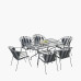 This set features a rectangular table and six stackable chairs with curved backs and armrests for comfort. Elegant ivy detailing adds a decorative touch, while a central parasol hole offers shade in sunny weather. Made from premium dark grey steel with a Thermosint coating, it’s built to resist rust and temperature extremes for long-lasting use.