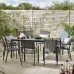 Our Dubai Outdoor 8 Seat Dining Table & Chairs in grey metal with grey wood-effect tabletop. UV & water resistant for garden & patio spaces.