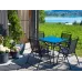 This dining set comes with four, foldable and lightweight chairs. They are constructed from powder-coated black steel and textile on backrest and seat. The thick table top features tempered glass. The whole set is easily movable and will come handy on a balcony, terrace or by the poolside.