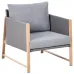 Bring mellow comfort to your garden with this 5-seater lounger set, including a sofa, two armchairs, a table perfect for morning coffees and a versatile ottoman that can be used as a footrest or extra seat. Each piece features an aluminium frame finished with powder coating and heat transfer that gives it a wood grain look. While it ensures the natural beauty of wood, the frame retains all the advantages of metal: it’s easier to maintain and more durable. The table’s glass top is enhanced with digital printing, making the stone-look pattern visually striking. For added practicality, the grey cushions come with water-repellent covers and convenient zippers, ensuring effortless cleaning.