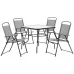 ● Five-piece patio dining furniture includes four chairs and a matching dining table; ● Foldable chairs are lightweight, easy to move and store; ● Tough tempered glass tabletop can be cleaned easily. Middle hole for holding parasol umbrella; ● Strong powder-coated metal frames for durability outdoors; ● Texteline seats are breathable and easy to clean; ● Table requires assembly;