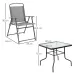 - ● Colour: Grey; ● Material: Metal, Texteline, Tempered Glass; ● Table Dimension: 80L x 80W x 71H cm; ● Chair Dimension: 55W x 63D x 90H cm; ● Chair Folded Dimension: 85L x 55W x 6H cm; ● Seat Dimension: 44W x 42D cm; ● Seat Height: 44cm; ● Backrest Dimension: 56L x 43.5W cm; ● Parasol Hole Diameter: 51mm; ● Weight Capacity: (table) 70kg, (chair) 114kg; ● Item Label: 84B-697GY;