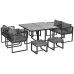 ● Nine-piece set seats eight: 1x table, 4x armchairs and 4x footstools; ● The chairs and the footstools can be stored under the table to save space; ● Rope decoration on the chair arms and backs for distinct character; ● Aluminium frames are strong and supportive. Sleek and safe tempered glass tabletop; ● Padded cushions for comfort, with removable and washable covers; ● Assembly required