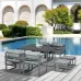 • Perfect for your outdoor and garden spaces, patios and more; • Footstools and chairs tuck neatly under the table when empty; • Padded cushions on chairs and ottomans for comfort; • Tempered glass table top for a solid and sleek surface; • Strong weather-resistant aluminium frame; • Assembly required;