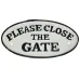 Please close the gate round sign. Cast Iron. White background with black raised writing and black outline. 2 screw holes, 1 in the centre of each end. Antique style finish. Great on a fence, gate or door. Length: 17.5cm approx. Width: 9cm approx. Depth: 6mm approx. This item is NEW, but comes in "Rustic" condition and is being sold as pictured.