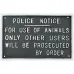 Police Notice sign / plaque. Sign reads "Police Notice, For Use Of Animals Only, Other Users Will be Prosecuted By Order". Cast Iron. Black background with white raised writing. 4 screw holes. Antique style finish. Great on a fence, gate or door. Length: 28cm approx. Width: 18cm approx. Depth: 1.2mm approx. This item is NEW, but comes in "Rustic" condition and is being sold as pictured.