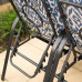 - Quick and simple construction, 150gsm blue polyester parasol with crank, Powder Coated Steel furniture, Complementary black tables and chair frames, 6 reclining armchairs, 2 stools