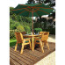 Four traditional chairs | One rectangular table (L-1370mm, W-950mm, H-800mm) | Complete with hole for parasol | Traditional four-seater dining set | 10-year rot-free guarantee | Treated with an oil-based water repellent preservative | All materials MT-sourced