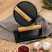 Pre-seasoned cast iron round grill with wooden handle. Ridges create score marks to the food. Can be used on any heat source, including induction.